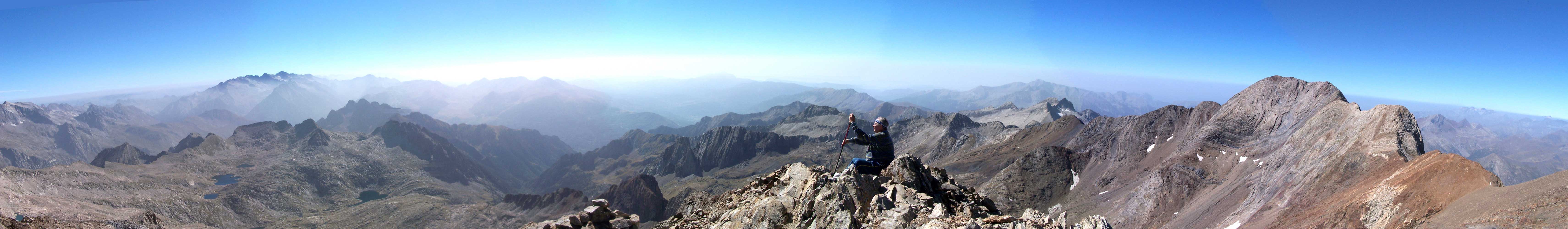 La vista de los Ibones bajo el Posets, de la Maladeta con el Aneto al fondo, de Ricardo afilando el bastón, y tras él el Espadas, desde la Cresta del Posets, a 3.308 m. |