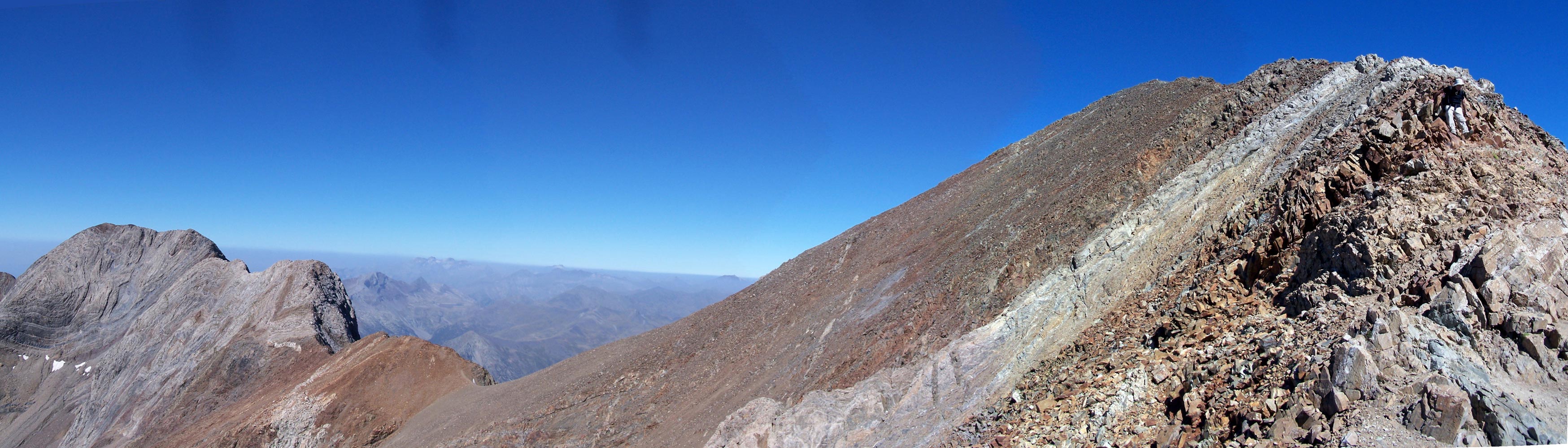 Obsérvense dos avezados senderistas (no son de los nuestros...) en la cima del Espadas, a más de tres mil metros, moviéndose fácilmente por su cresta. |