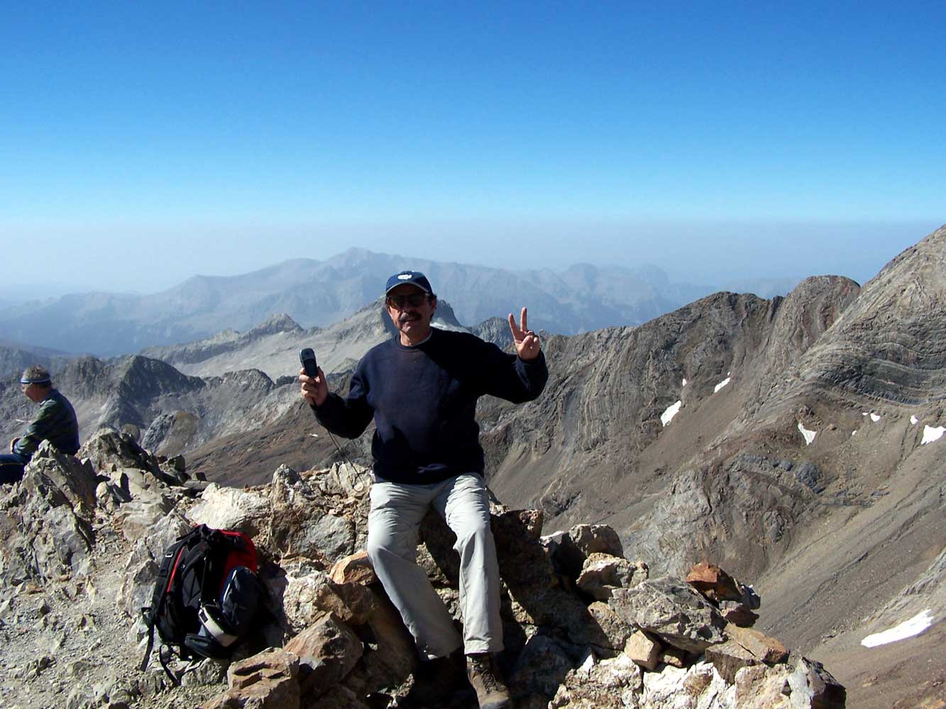 José Vicente, con el GPS dando fe de los 3.308 metros de altura de la Cresta del Posets, detrás descansa Ricardo. |